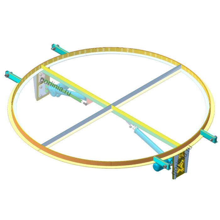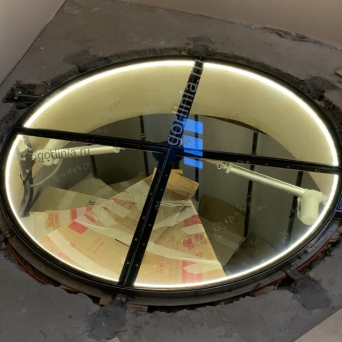 Редукторы подъемника крепятся к вертикальной платформе рамного основания горловины, шток - к импосту стеклопакета. Актуаторы европейской сборки работают синхронно, длина базы и мощность усилия подобраны под массогабаритные характеристики светопрозрачных полукруглых створок.
