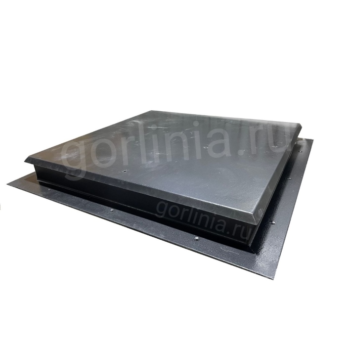 Откидная квадратная крышка зашита сверху гладким кровельным листом 2 мм с загнутыми книзу краями, вылетающими на 25 мм за периметр коробки. Внутри каркаса створки между ребрами обвязки проложен рулонный минеральный утеплитель 50 мм, подшитый снизу сталью 1 мм.