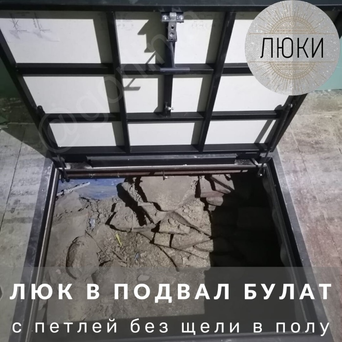 Конструкция смещенного за ось узла шарнира позволяет плиточникам убрать щель над петлей, сохранив при этом важный размер лаза в чистоте 1050х600 для комфортного спуска в подвал.