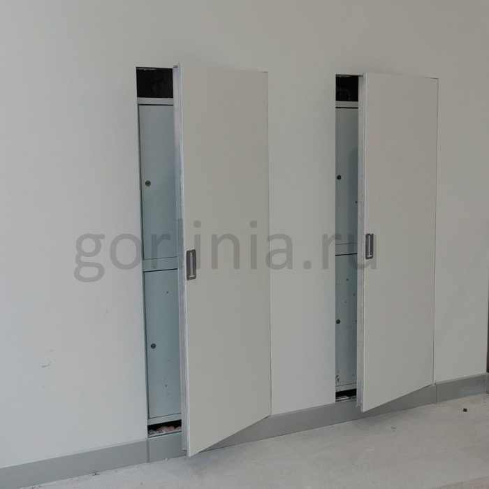 В огнестойкой версии в полотно дверцы прокладывается базальтовая вата, закрывается вторым контуром ГСП-DF. В раме проклеивается сплошная терморасширяющаяся лента для защиты от огня и холодного дыма.